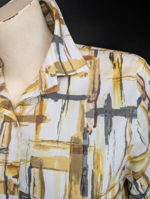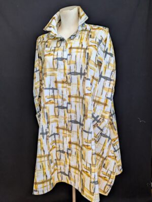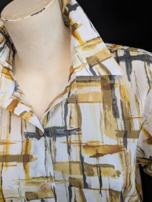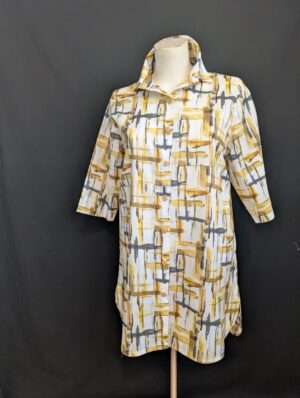 Partager ce produit avec vos amisBella Grande chemise 100% coton , imprimé gris et ocre sur fond blanc cassé. Poches latérales, empiètement dos, pli d’aisance…