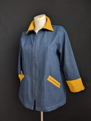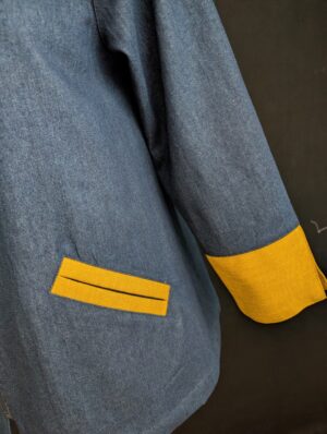 Partager ce produit avec vos amisMarla Veste/manteau en denim bleu combo ocre. Ligne A, poches passepoilées, zipper devant, longue manche avec poignet fente. Hanches: P…