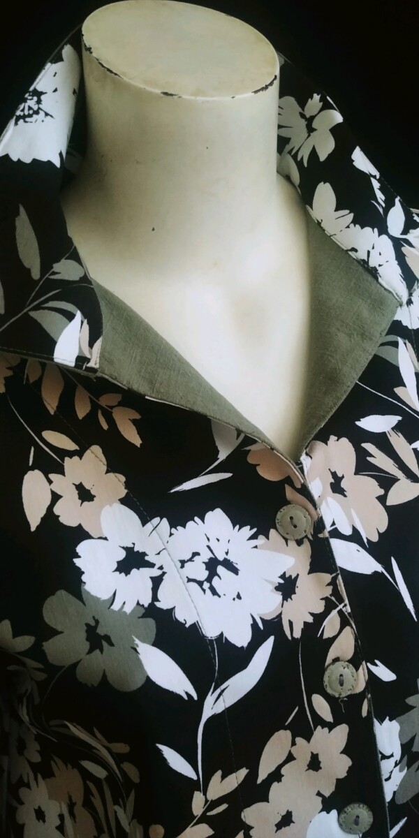 A line jacket in a cotton/spandex canvas. Floral print , kind of an asian feeling with the print to it. Pagode sleeve, cut pockets and back collar in Sage linen color contrast.