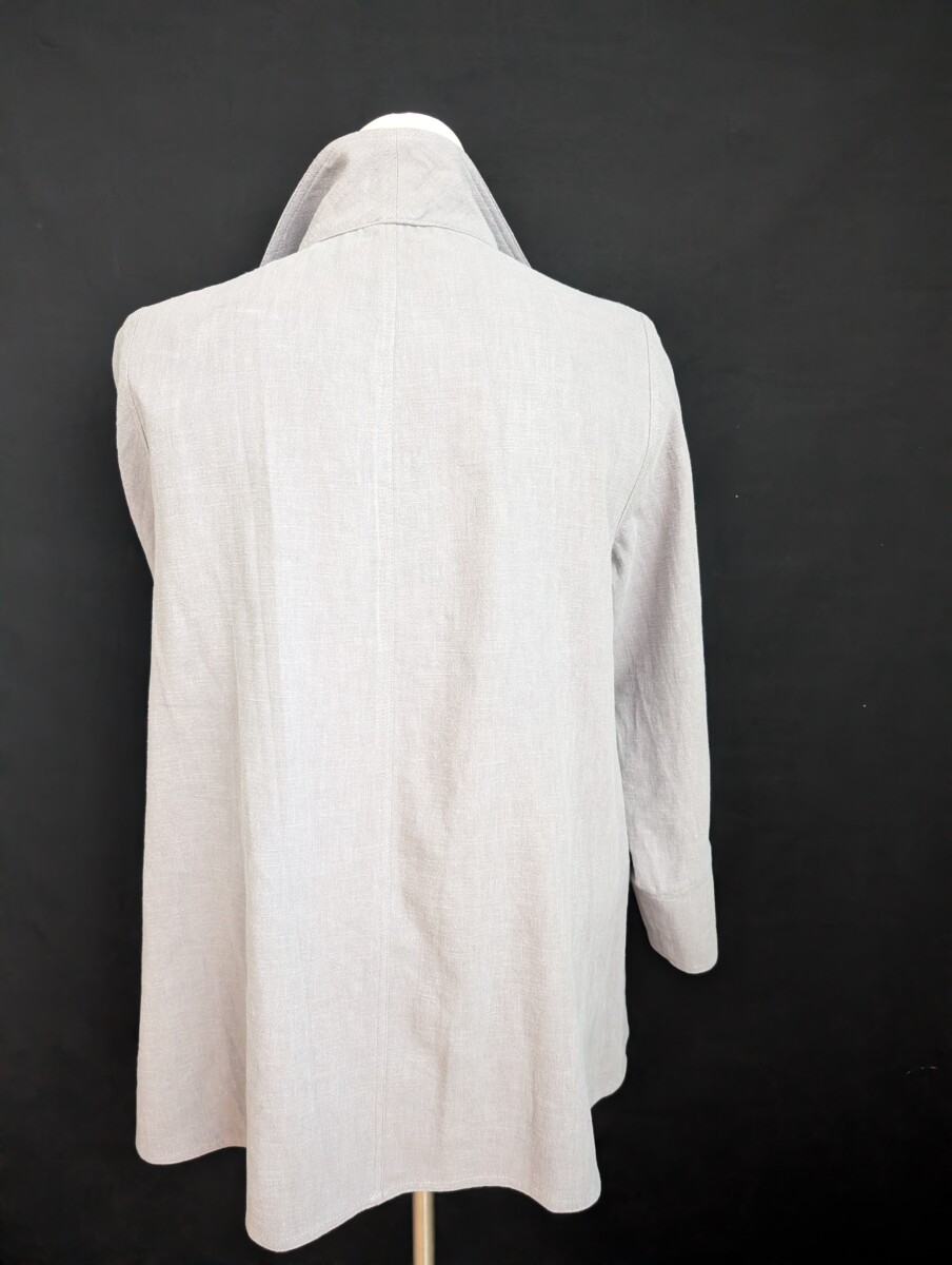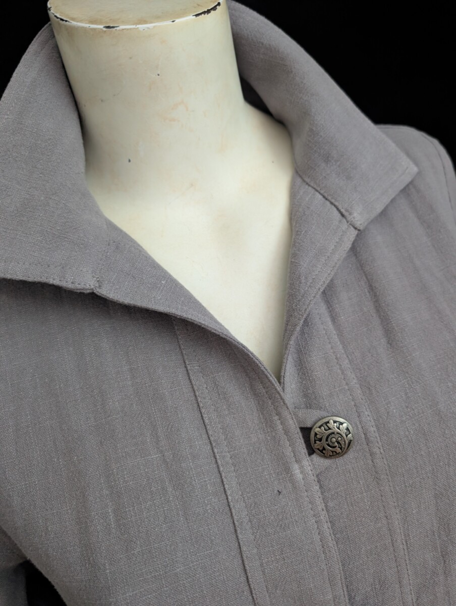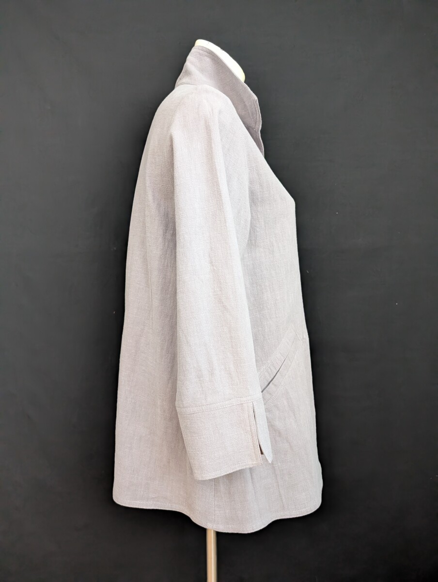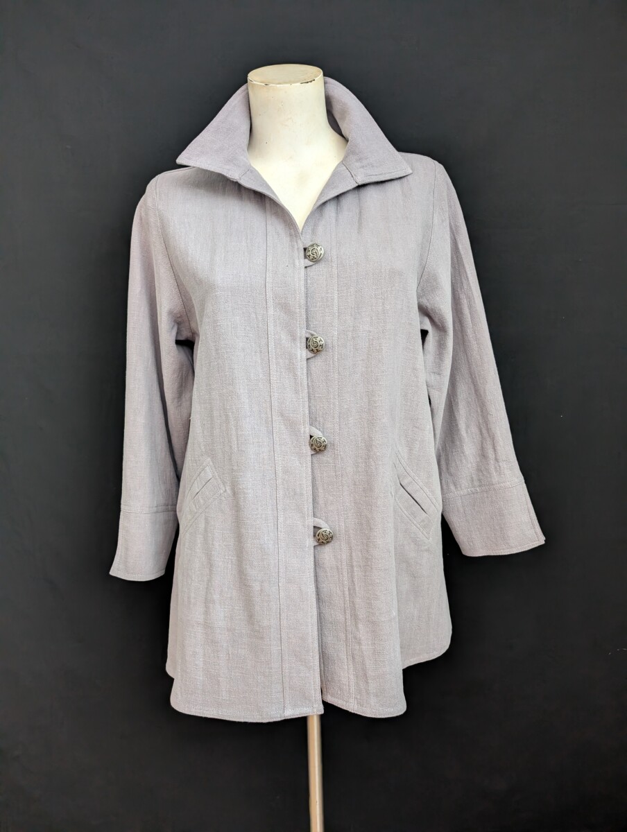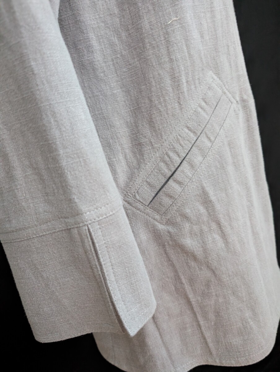 OK, my classic SIGNATURE A line jacket. This time made in 100% stone washed ramie, natural fiber that looks like a medium weight linen. Loops closure, metal buttons, cut front pockets, long sleeve with slit cuff. Grey iron color.