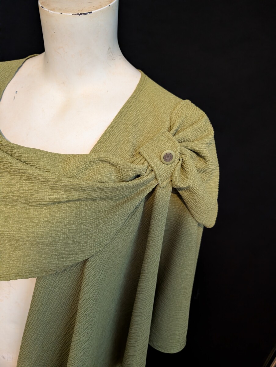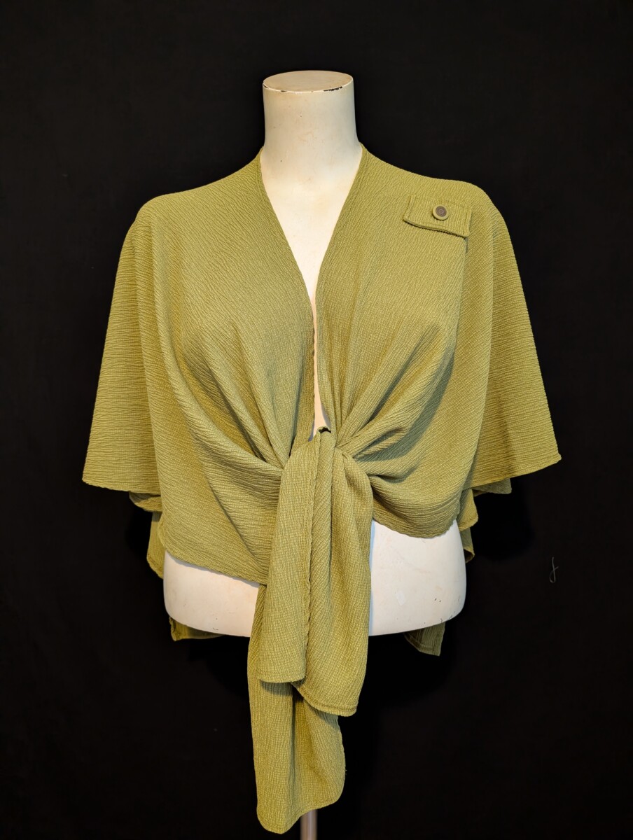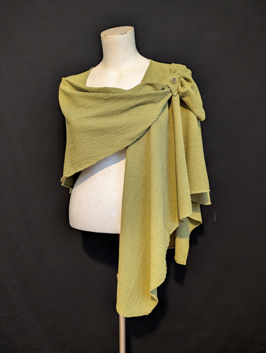 Beautiful short cape in this poly/spandex light knit . Chartreuse color. Three ways that you could wear it.