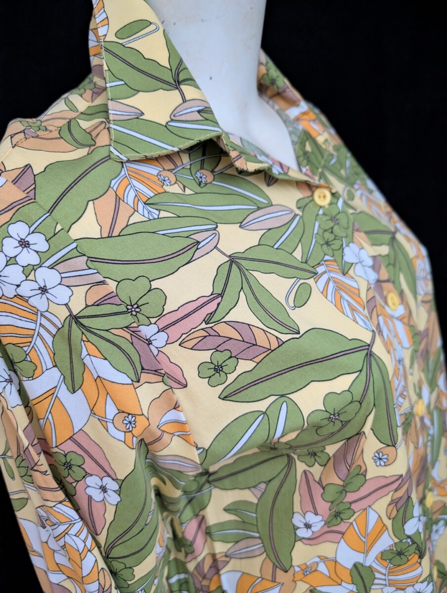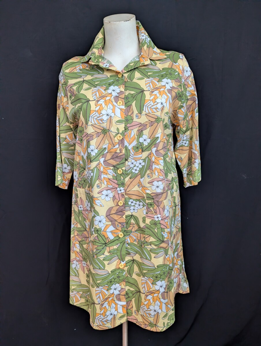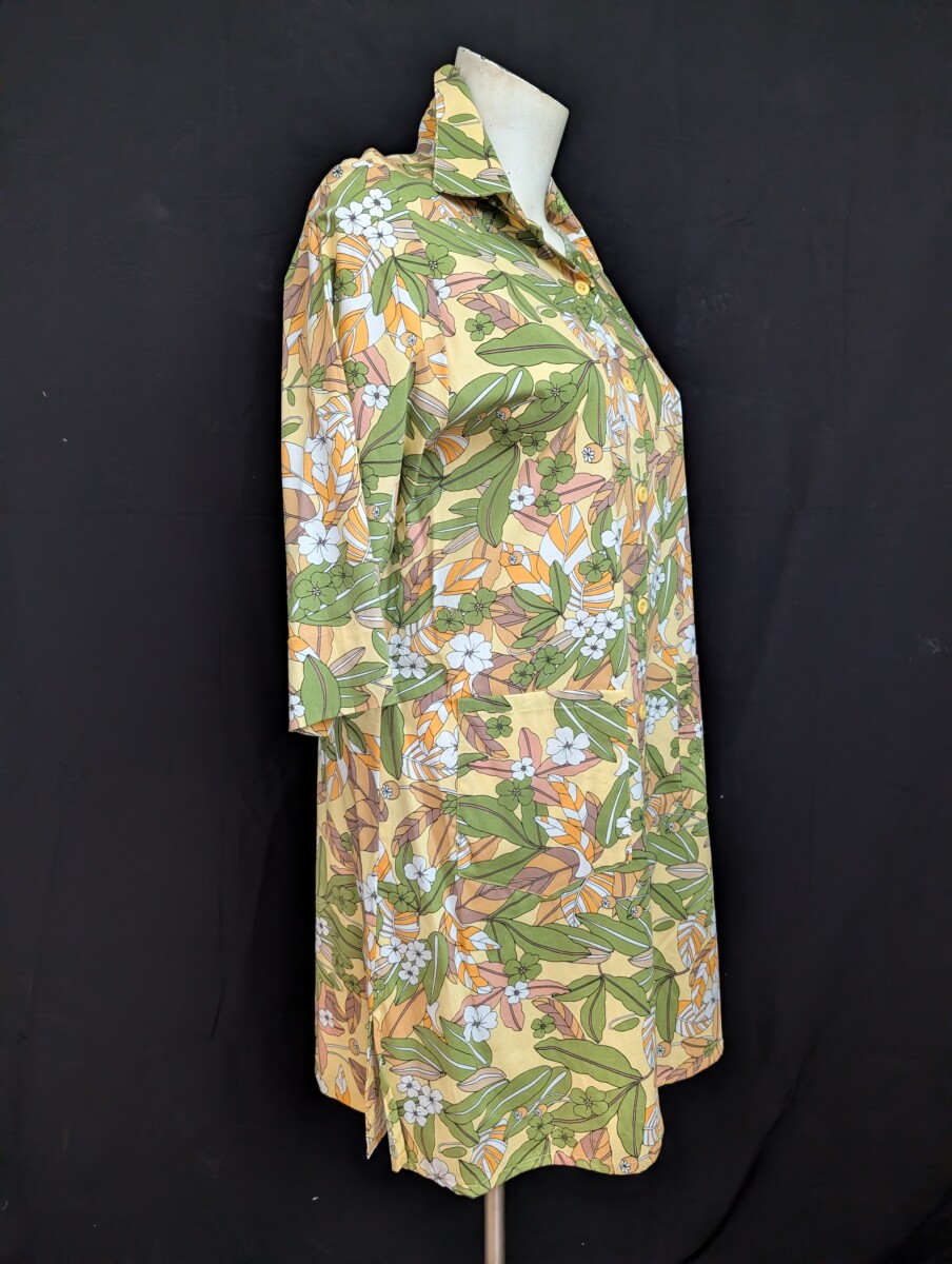 Robe chemisier en coton ave un imprimé rétro. Boutonnage et poches applquéees devant, manche au coude, fentes latérales.
