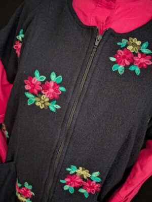 $119.00$59.95Partager ce produit avec vos amisPartager ce produit avec vos amisVeste sans manche, encolure ronde, zip et poches appliquées devant. Laine bouillie marine brodée de fleurs Hanche: 133 cm