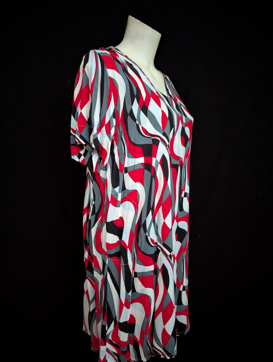 Robe 100% rayon, encolure en V, manche courte et poches latérales. Coupe légèrement ligne A.