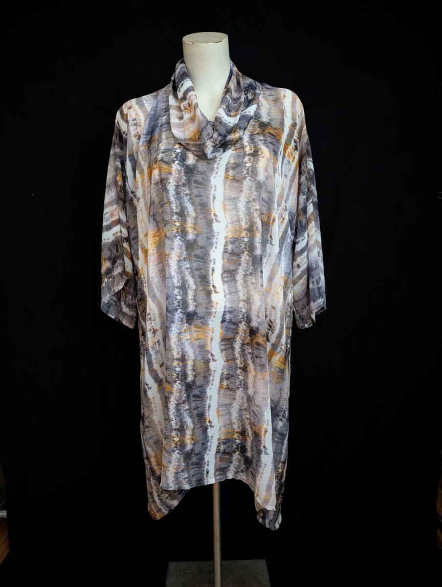 Longue tunique ou chasuble en chiffon de polyester imprimé Tye Dye. Col tube, manche à même. Pourquoi pas en tenue de plage. Versatile.