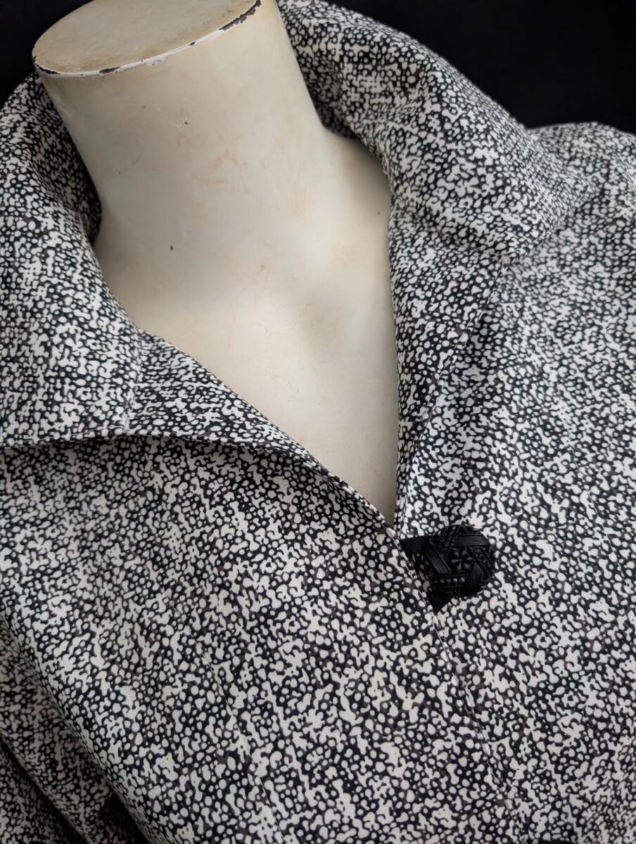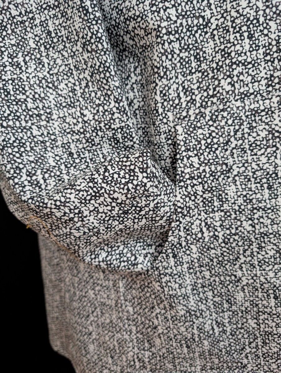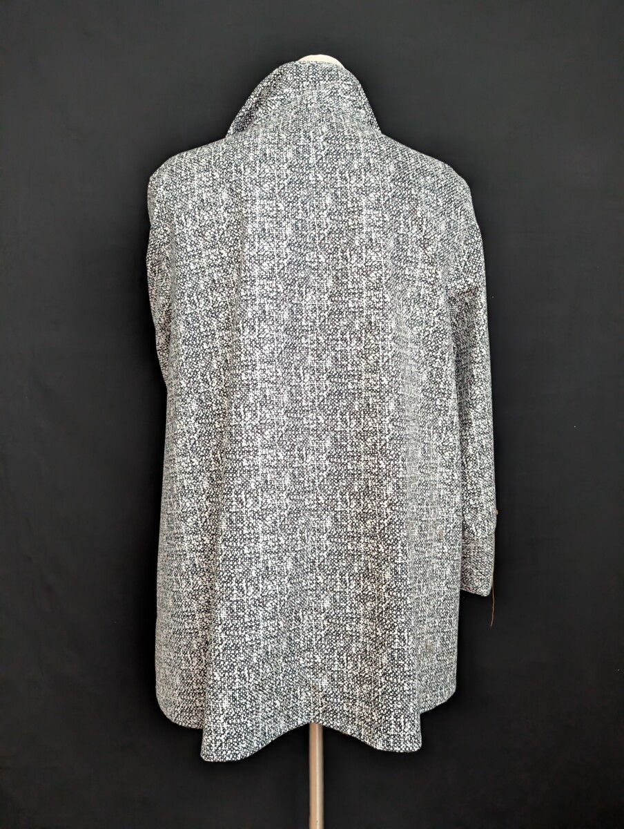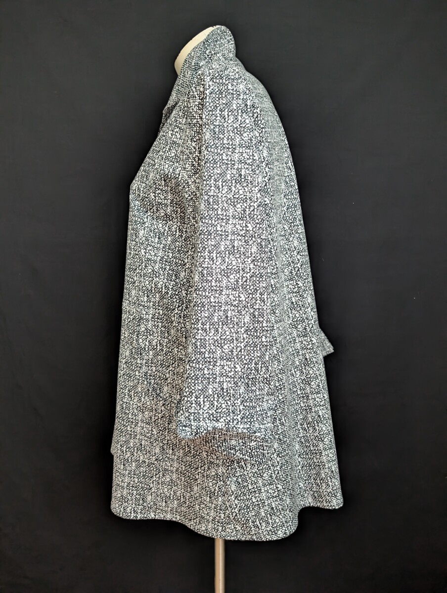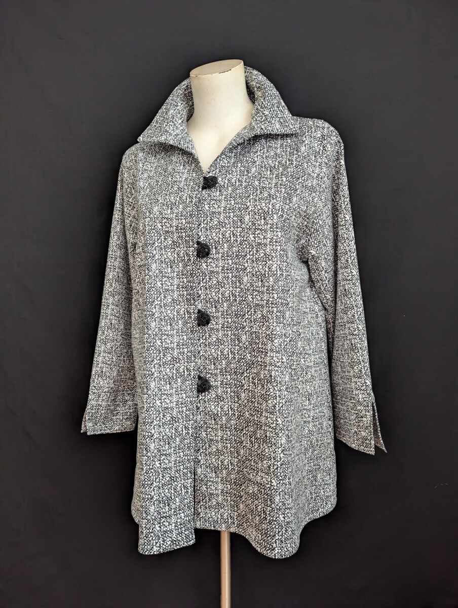 Ok ok. Ma veste classique mais WOW, le tissus rend cette veste absolument maginfique, confortable et 4 saisons. Un tricot tissé et entoillé serré de polyester et spandex écru et noir. Coupe en A, poches appliquées style kangourou invisibles dû au motif. Boutonnage boucle. manche longue avec poignet fendu. Vraiment magnifique.