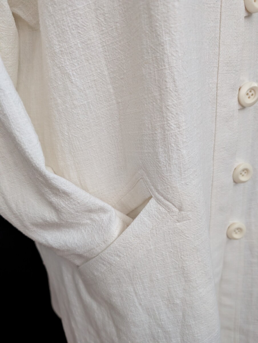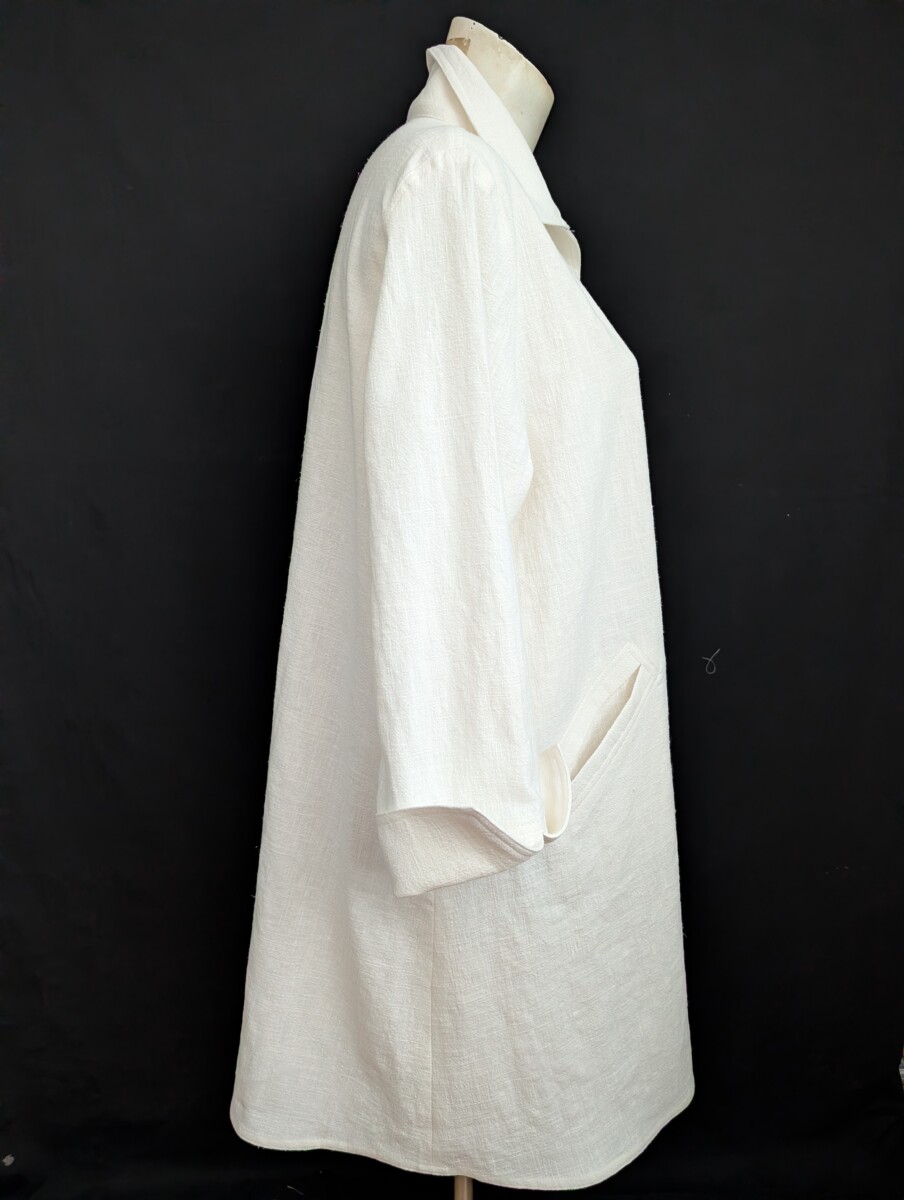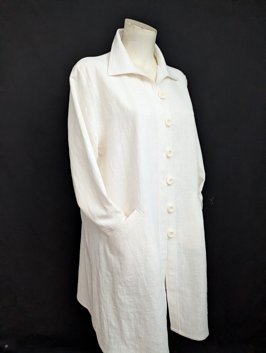 Version longue de ma veste Signature #4053. Veste ligne A 100% ramie lavé à la pierre , fibre naturelle qui ressemble à un lin de poids moyen. Boutonnage loops, boutons laqués en forme de rose, poches passepoilées, manche longue avec poignet fenfu. Couleur crème.