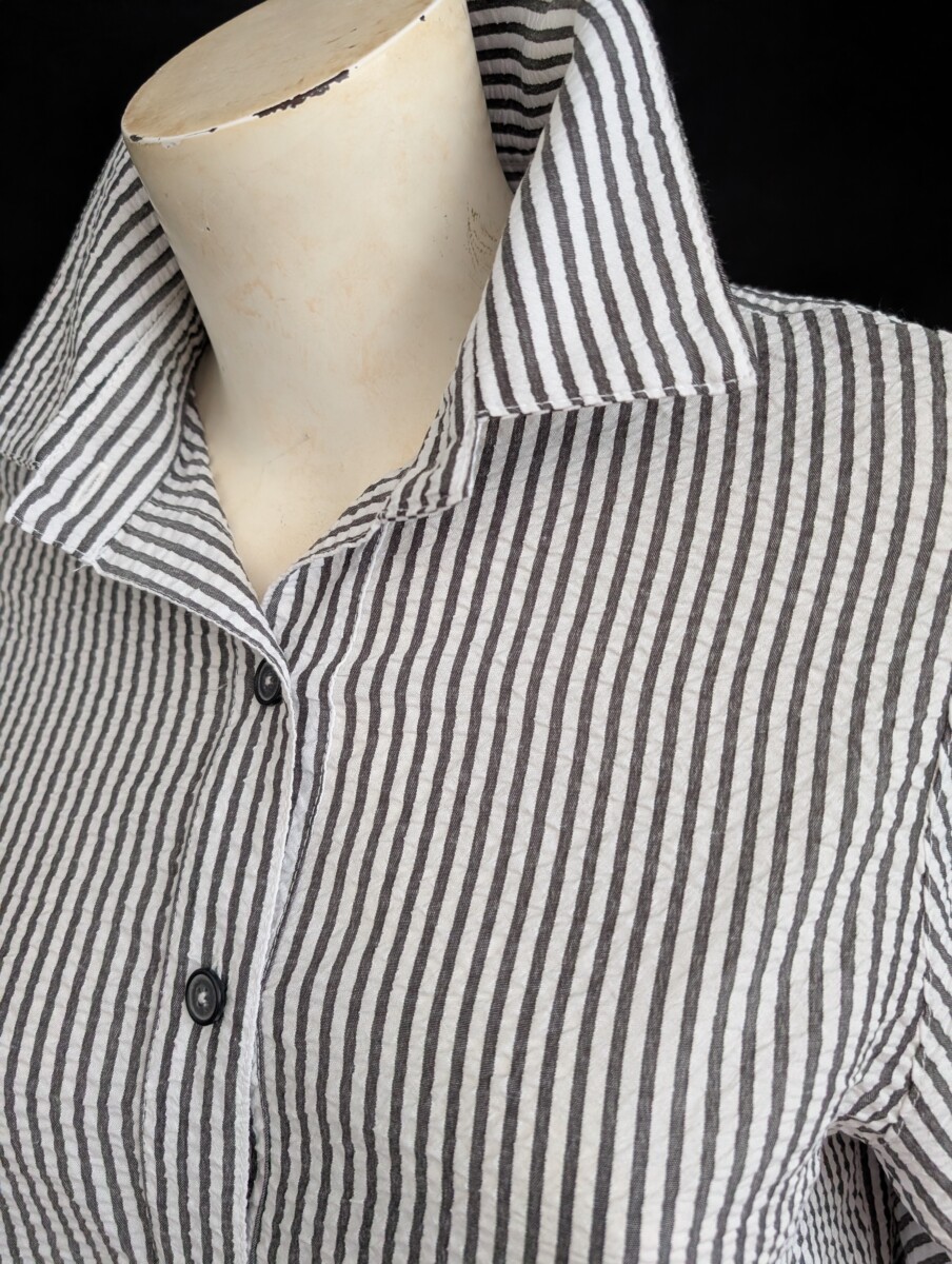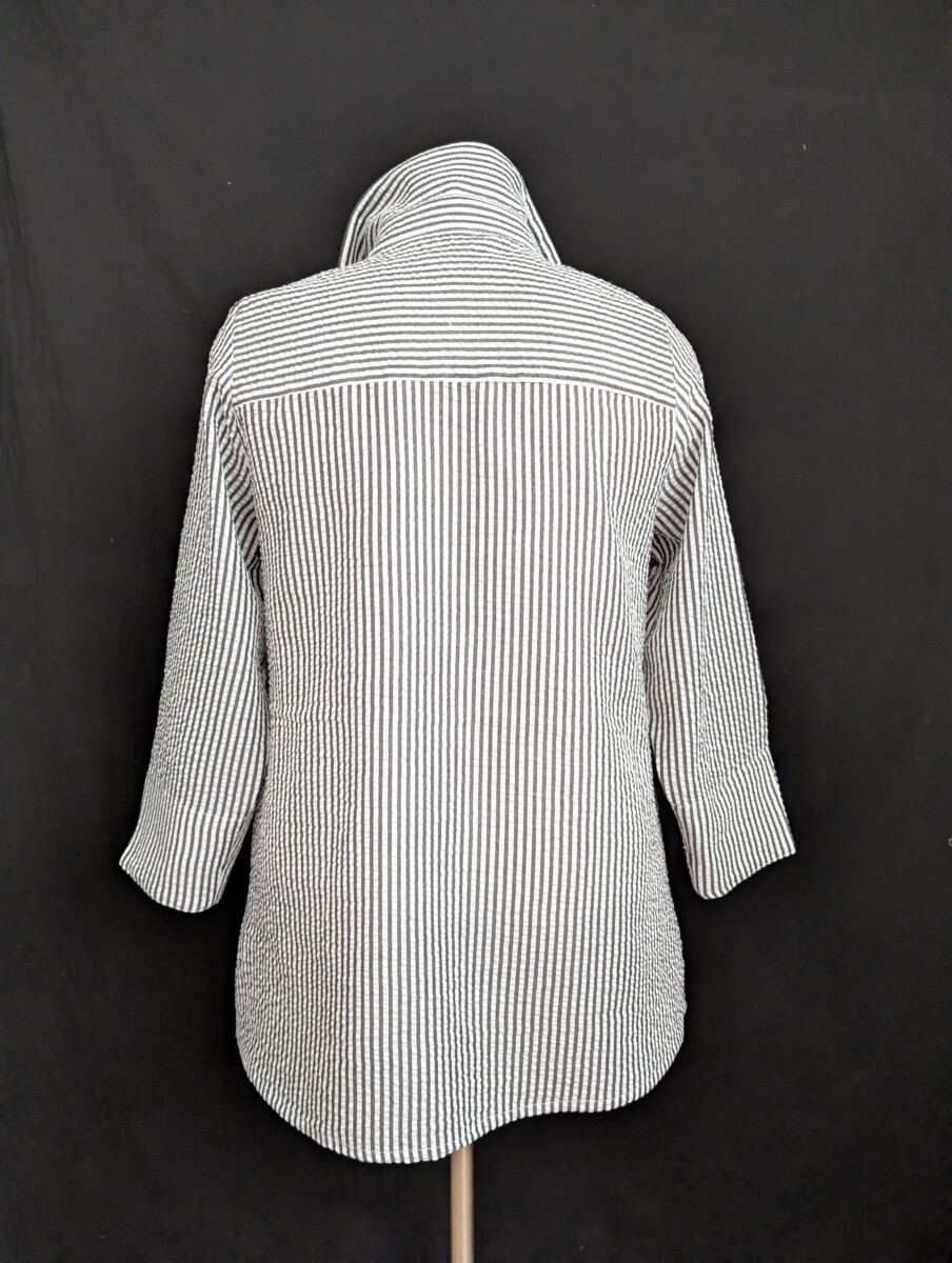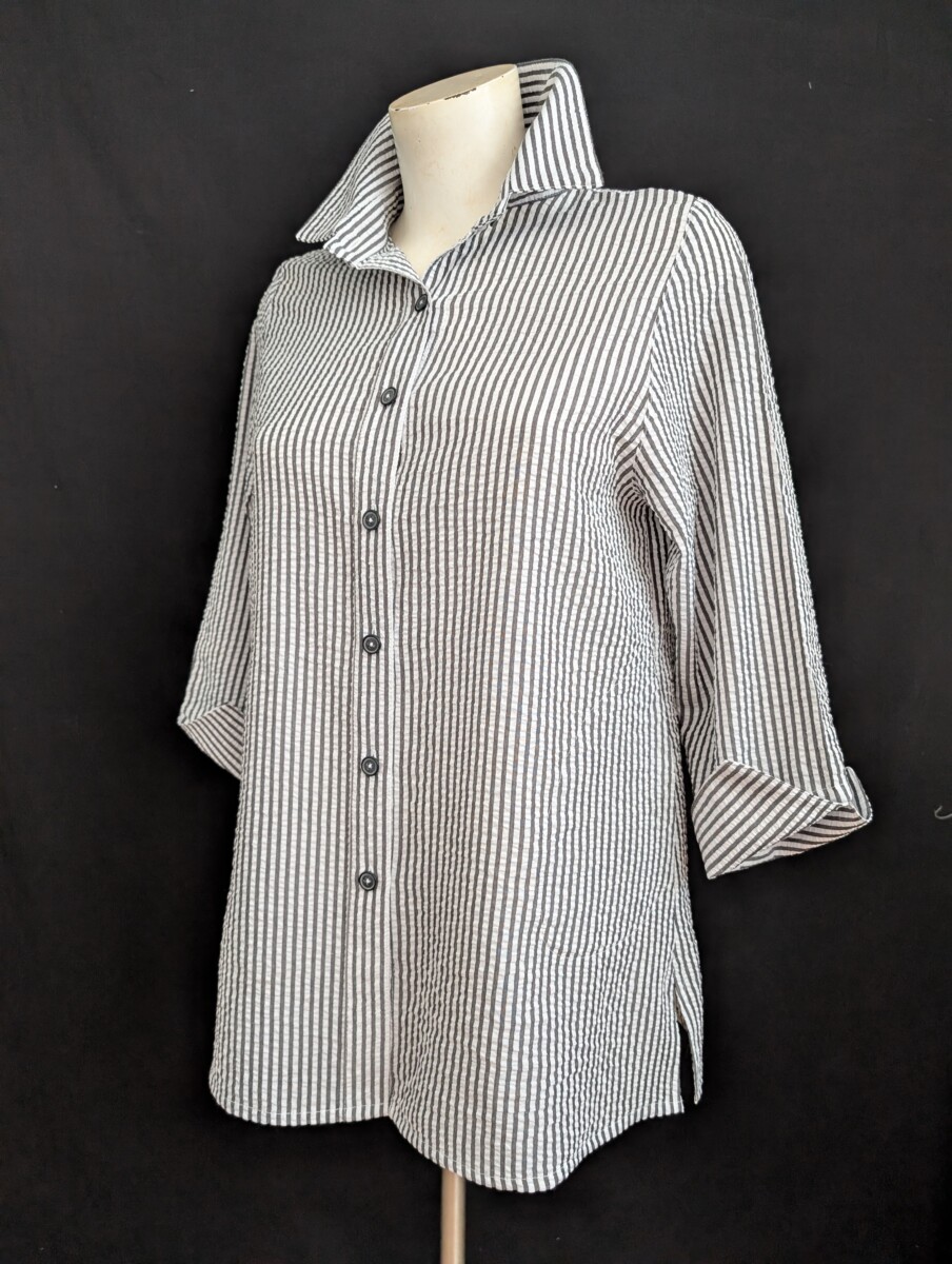 Chemisier ou surchemise en 65% coton /35% polyester SEERSUCKER , rayures grises sur blanc avec effet gaufré. Poches latérales, poignet fendu.