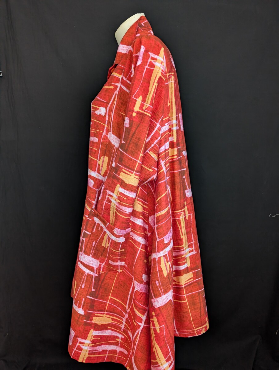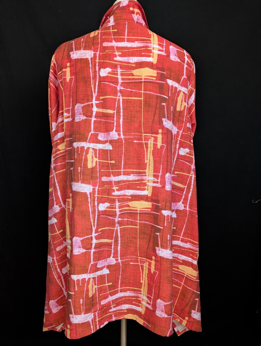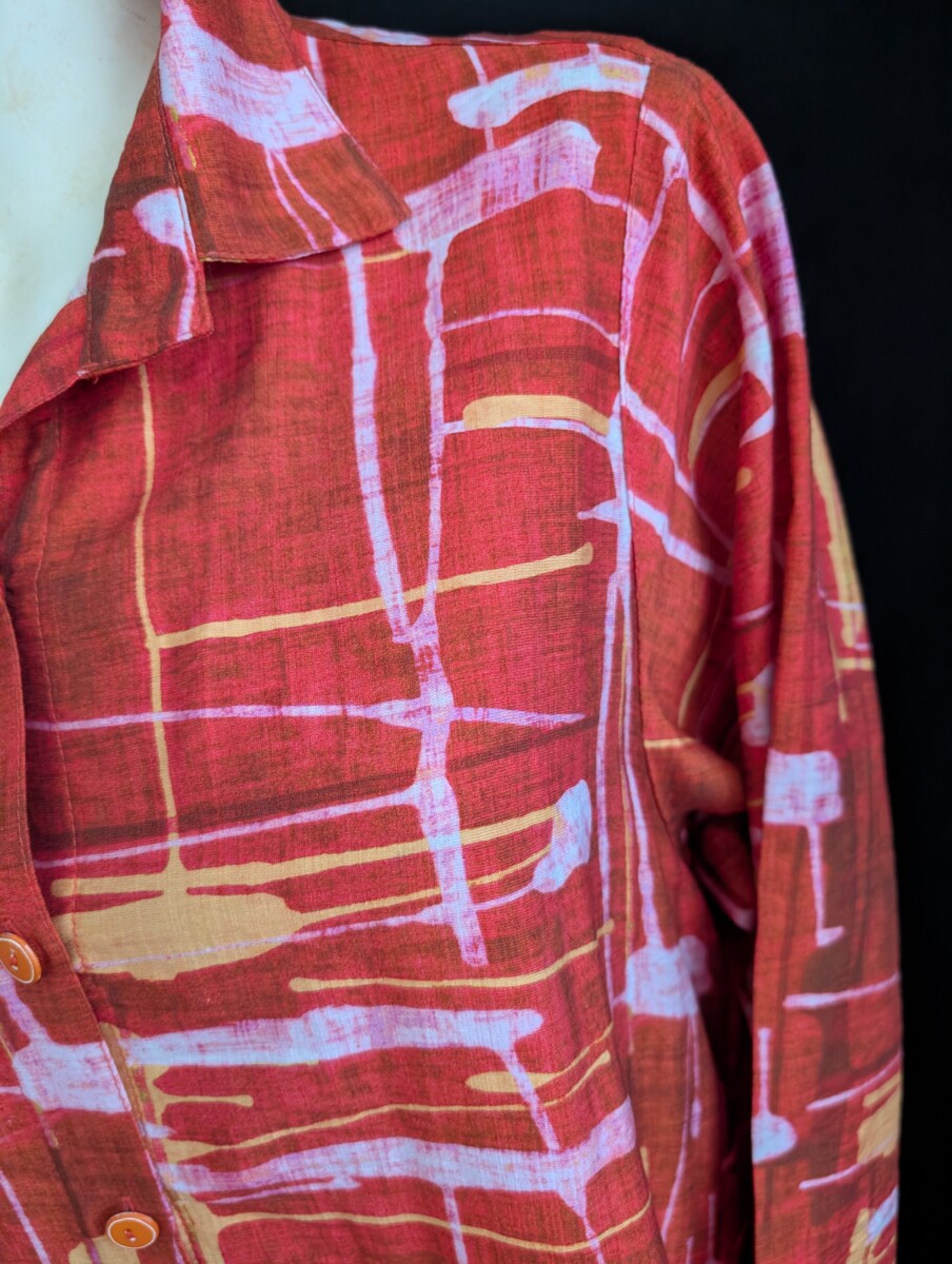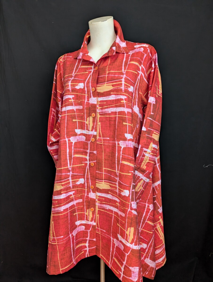 Grande tunique chemisier en rayone et coton assez épais. Poches devant, col chemisier, boutonnage devant, manche droite longue, ourlet asymétrique et beaucoup d’ampleur aux hanches. Épaule régulière.