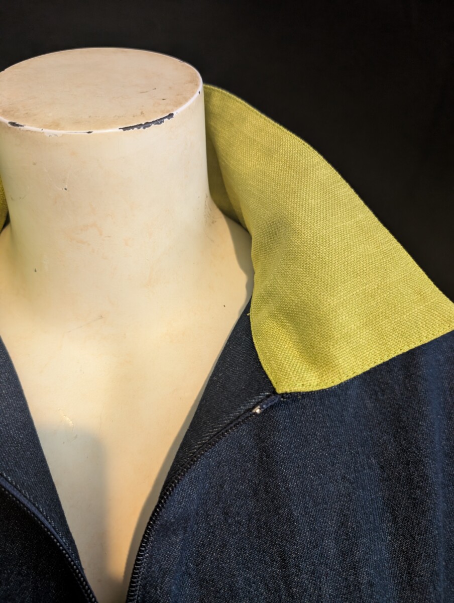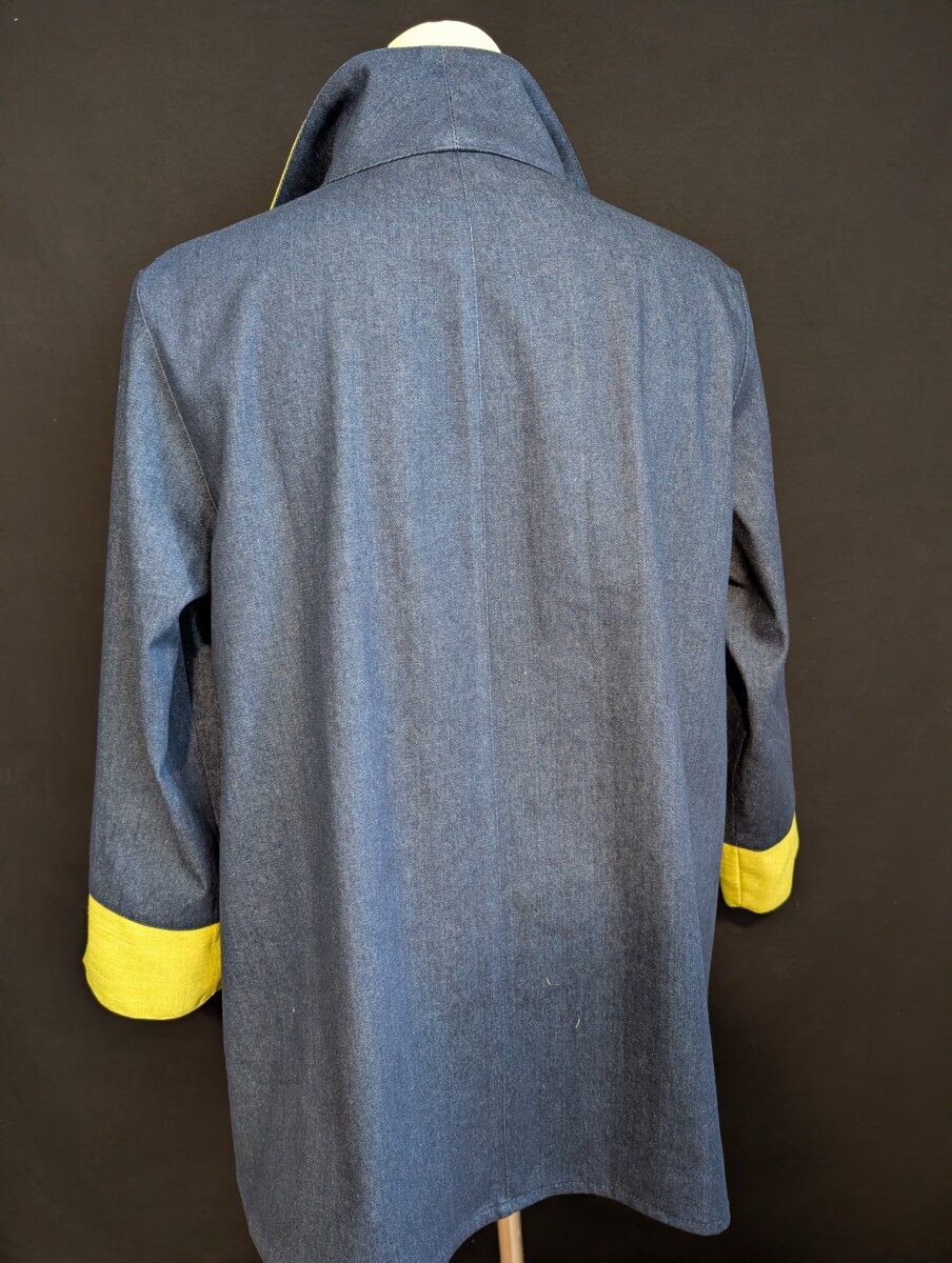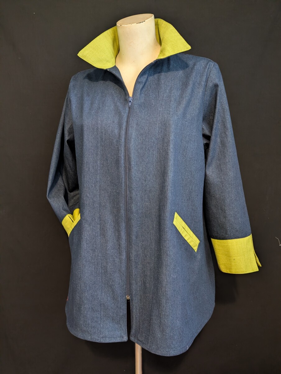 Veste manteau ligne A en 100% coton denim bleu combo lime. Poches passepoilées, zip devant, manche droite avec poignet fente.
