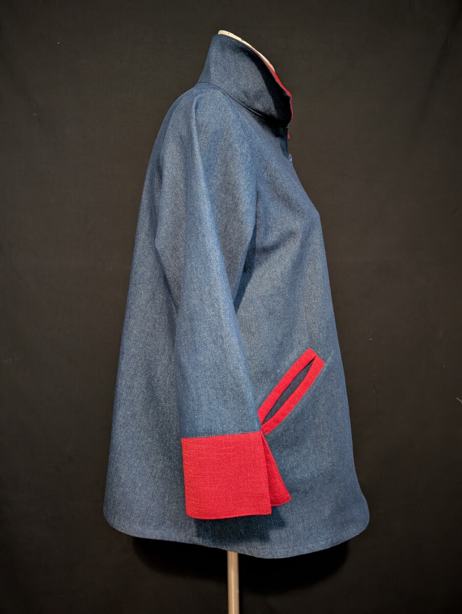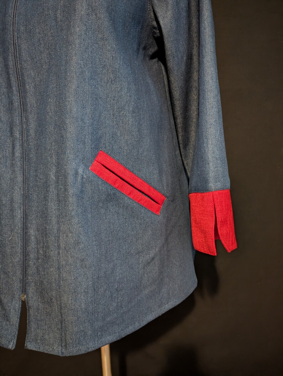 Veste en denim bleu avec combo rouge. Coupe en A, poches passepoilées, manche longue avec fente, zip devant.